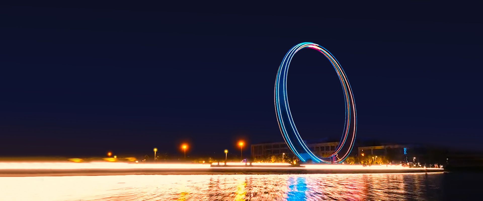 “櫻花湖之戀”是一座環形雕塑,坐落于威海櫻花湖體育公園。雕塑內部凹槽上,安裝12條由勇電定制二次封裝70線條燈組成的光帶,光帶沿著環形輪廓鋪設,夜間亮燈后將雕塑變身為一個巨大的色彩斑斕的變色環。而這些光帶與地面上的單車相連,可以通過傳感器將單車踩踏的速率轉換成控制信號,來改變燈光的變化形式和變化速度。燈光也就隨著騎車人車速的變化而變化。